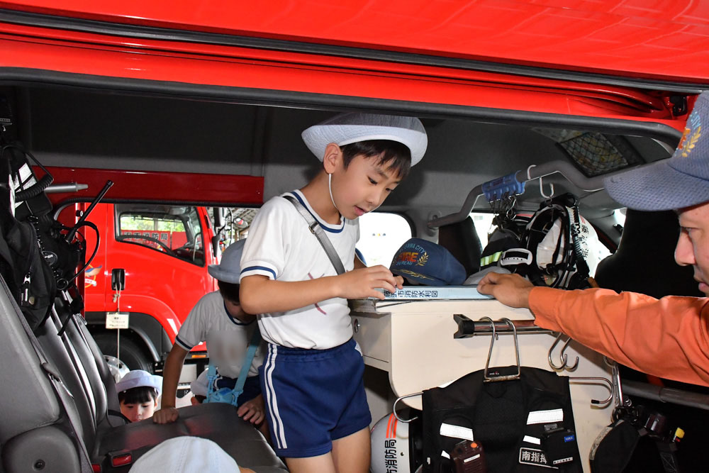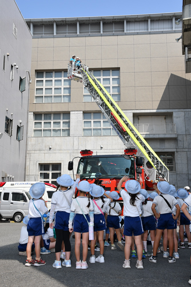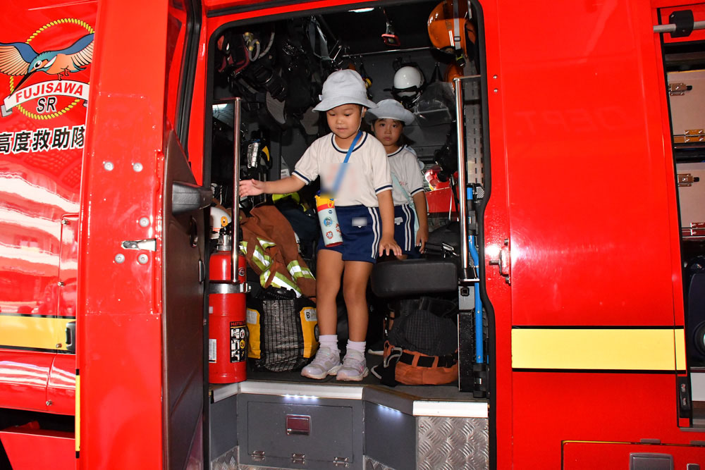消防署見学 Posted on 2025年10月10日2025年10月20日 by honbu 年長さんが、9月9日(火)と16日(火)に藤沢市南消防署に見学に行きました。 消防士さんが日頃お仕事をしている施設の中、たくさんの消防車・救急車を見せてもらいました。 はしご車が長く伸びている様子や、防火衣も着させてもらい貴重な体験ができました。 藤沢市南消防署の救助隊・消防隊の皆様、ありがとうございました。