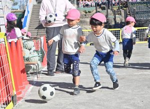 サッカー大会⚽ Posted on 2025年12月15日 by honbu 12月1日(月)・2日(火)に年長さんはサッカー大会を行いました。 この2日間は園庭にサッカーコートが設置され、周りにはチームの旗があり、幼稚園はサッカー一色になっていました。 どの試合も、白熱してとてもいい試合の連続でした。 年長さんのことを年中さん、年少さんもたくさん応援してくれていました。 保護者の皆様、2日間応援と観戦、ありがとうございました。