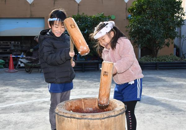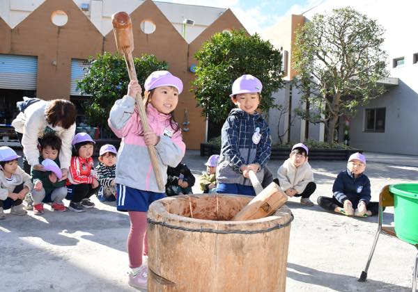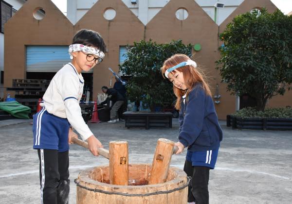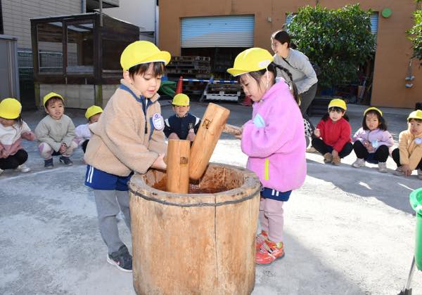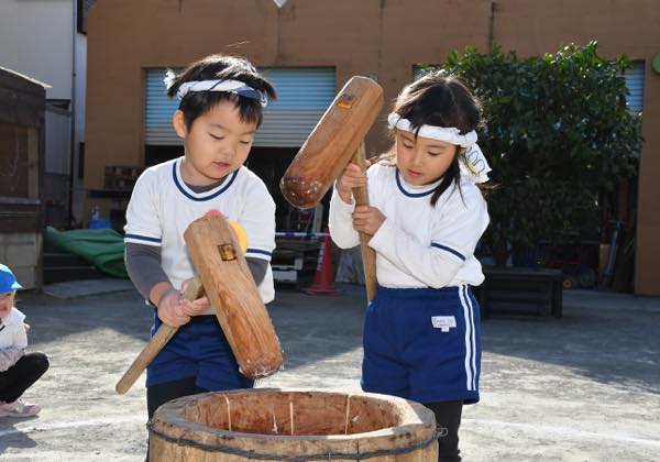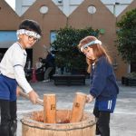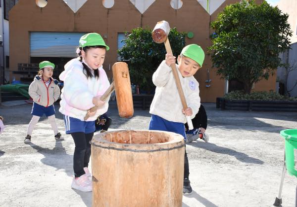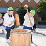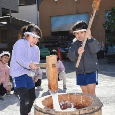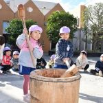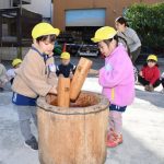おもちつき Posted on 2026年1月15日2026年4月1日 by honbu ぺったん、ぺったん、おもちつき 12月12日にお餅つきを行いました。 園庭では朝から焚火の煙が上がり、お餅を蒸しあげました。お米からお餅ができるまでのお話を聞いたり、鏡餅を作るためためにぺったん、ぺったんとお餅つきを体験しました。 出来上がった鏡餅は、1月に鏡開きをしました。